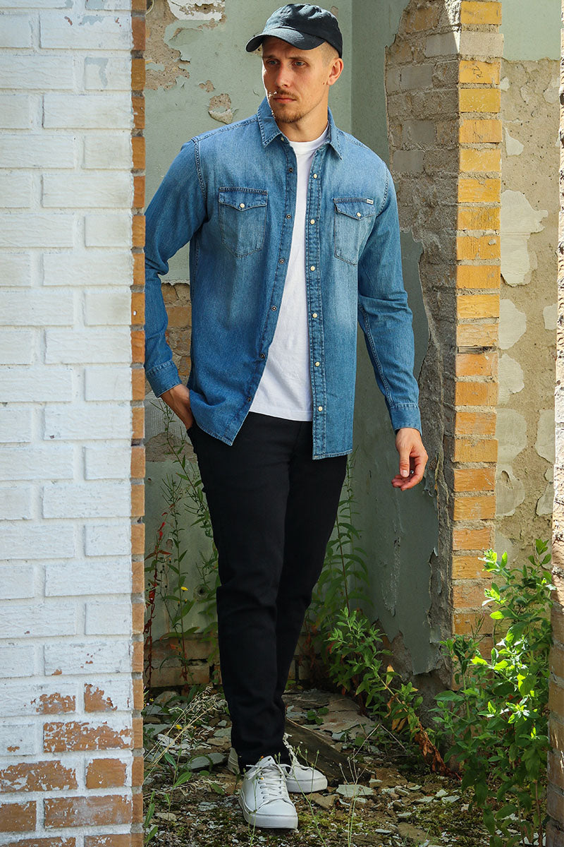 Dieses Langarmhemd zeichnet sich durch seinen klassischen Hemdkragen und die reguläre Passform aus, die für einen traditionellen und zeitlosen Look sorgt. Gefertigt aus 100% Bio-Baumwolle bietet es dank des natürlichen Materials ein weiches und atmungsaktives Tragegefühl. Die Knopfleiste sowie die geknöpften Manschetten und die Brusttaschen mit Knopfverschluss unterstreichen das klassische Design des Jeanshemds in einem mittelblauen Denimton.