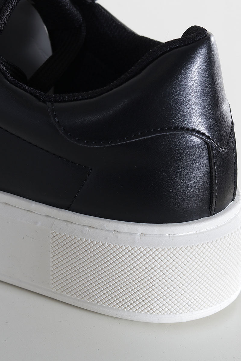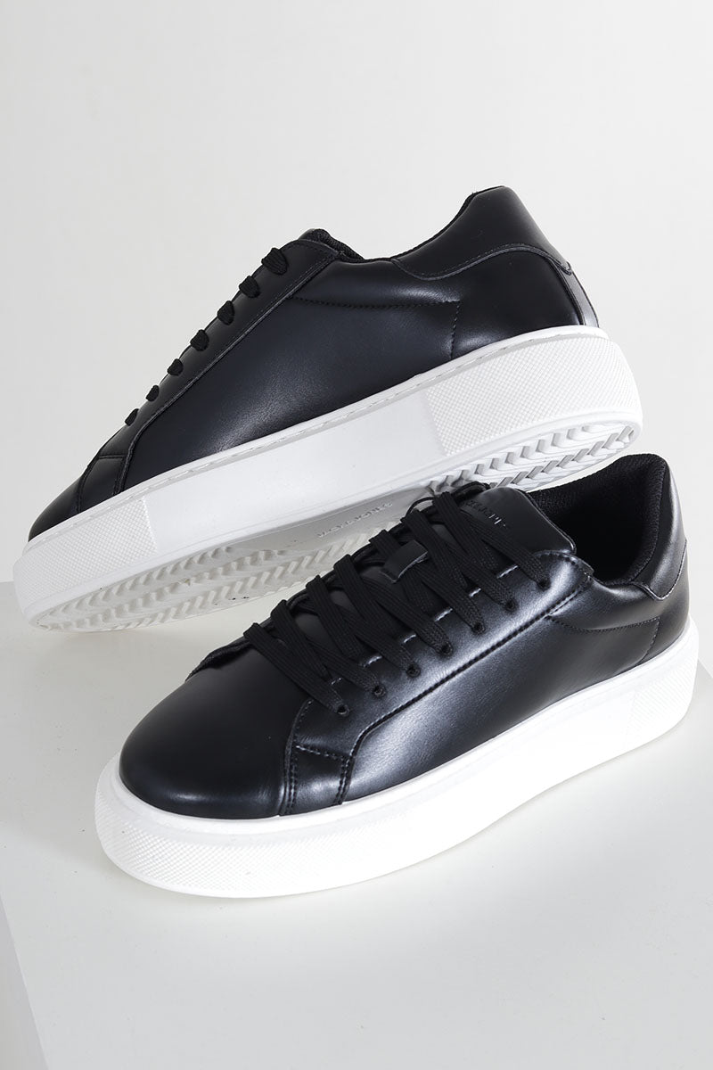 - Schwarze Lederschuhe mit weißer Gummisohle.