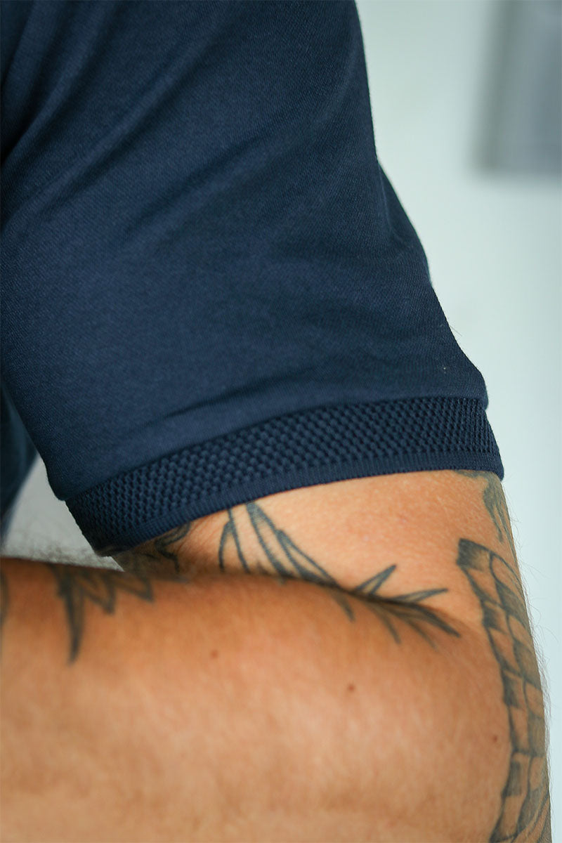 Dieses Polo mit kurzem Arm überzeugt durch seinen zeitlosen Schnitt und die angenehme Materialmischung aus 50 % Bio-Baumwolle und 50 % recyceltem Polyester. Es bietet dank des Regular Fits eine bequeme Passform und ist ideal für warme Sommertage. Das dezente, dunkle Blau ist vielseitig kombinierbar und verleiht dem Look eine elegante Note.