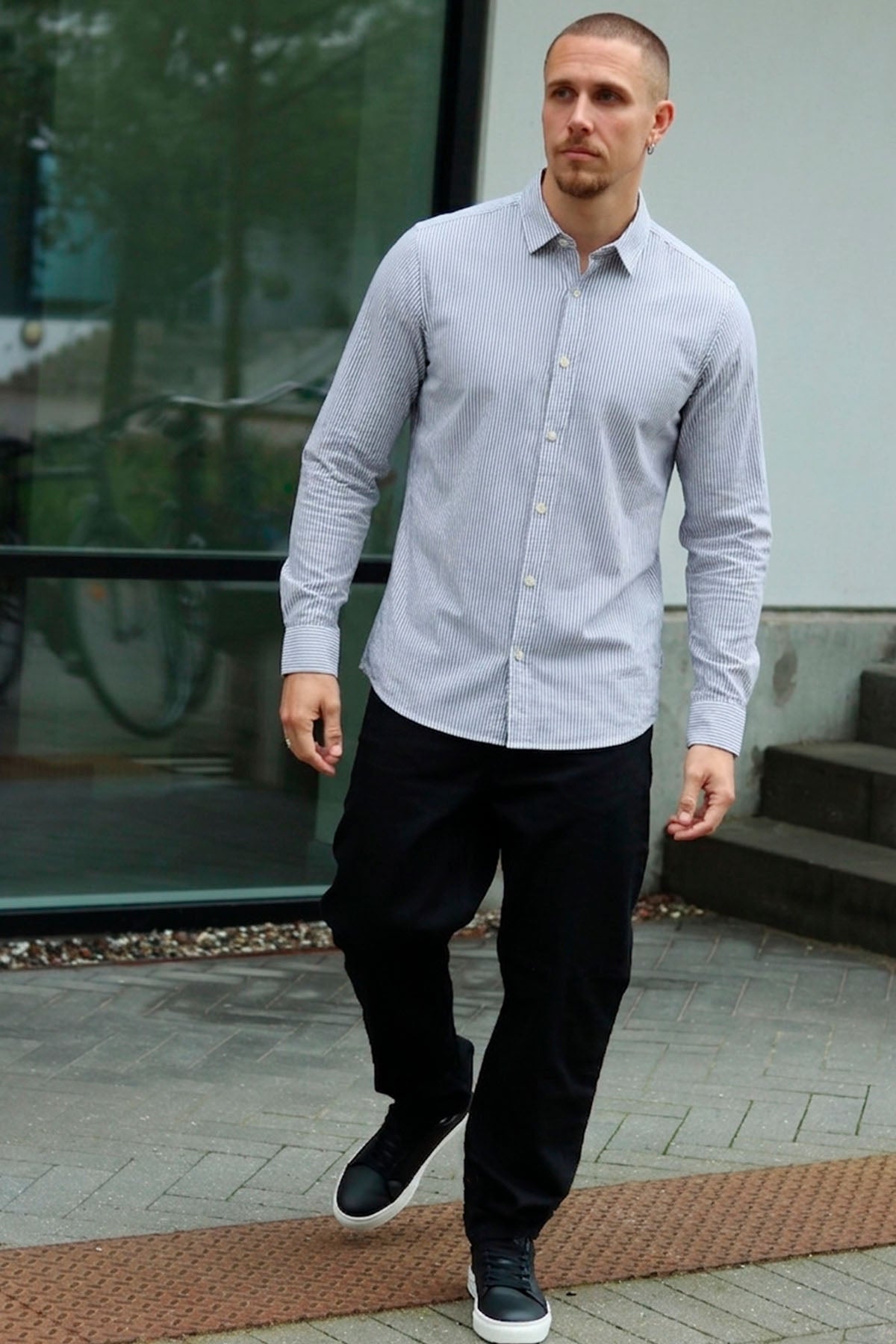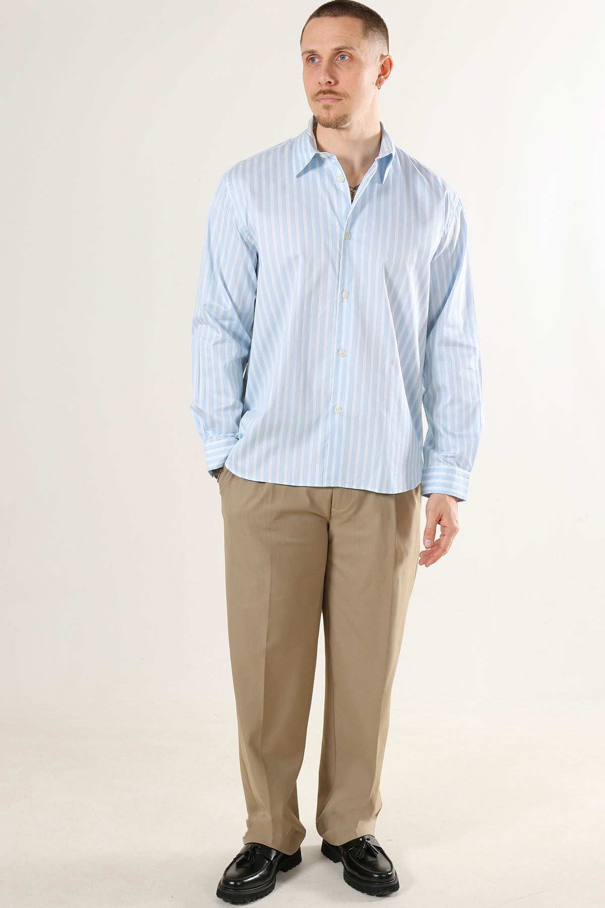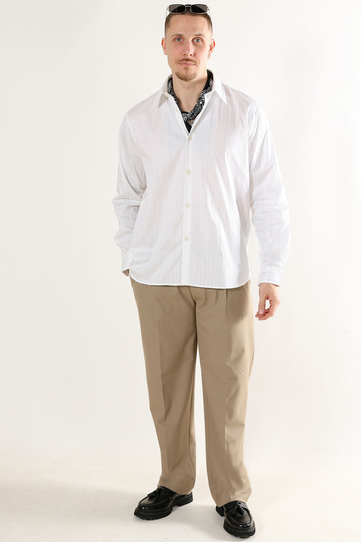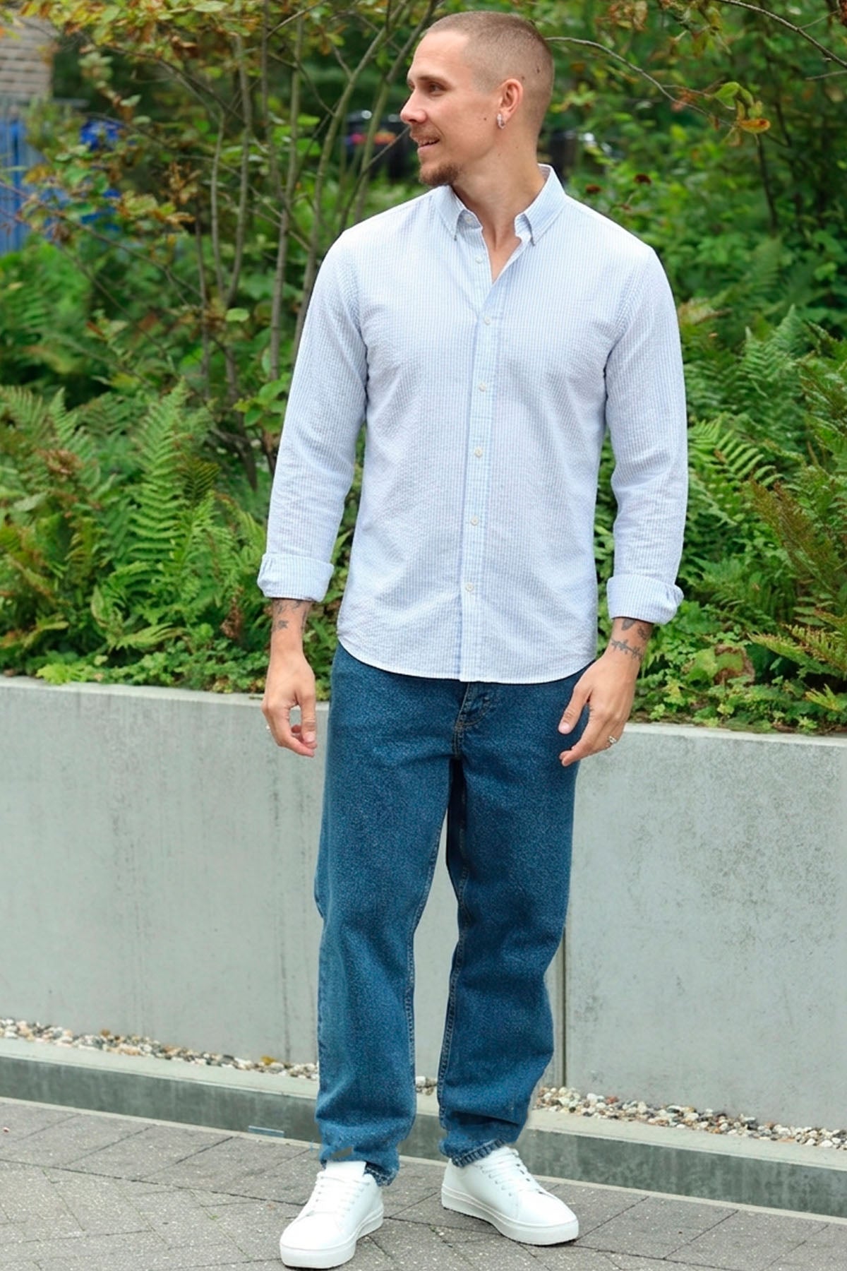 3. Das Hemd in die Hose stecken und mit einem Gürtel in Szene setzen oder aber locker über der Hose tragen