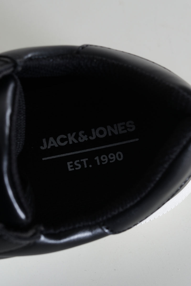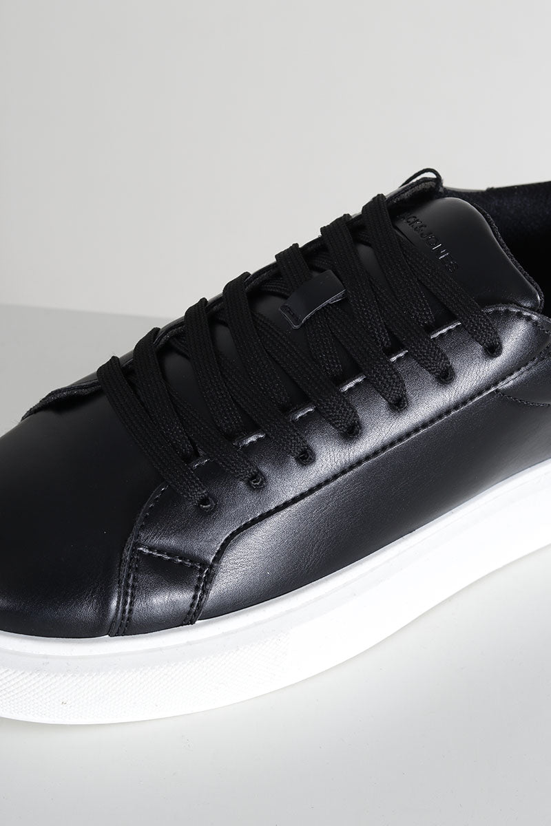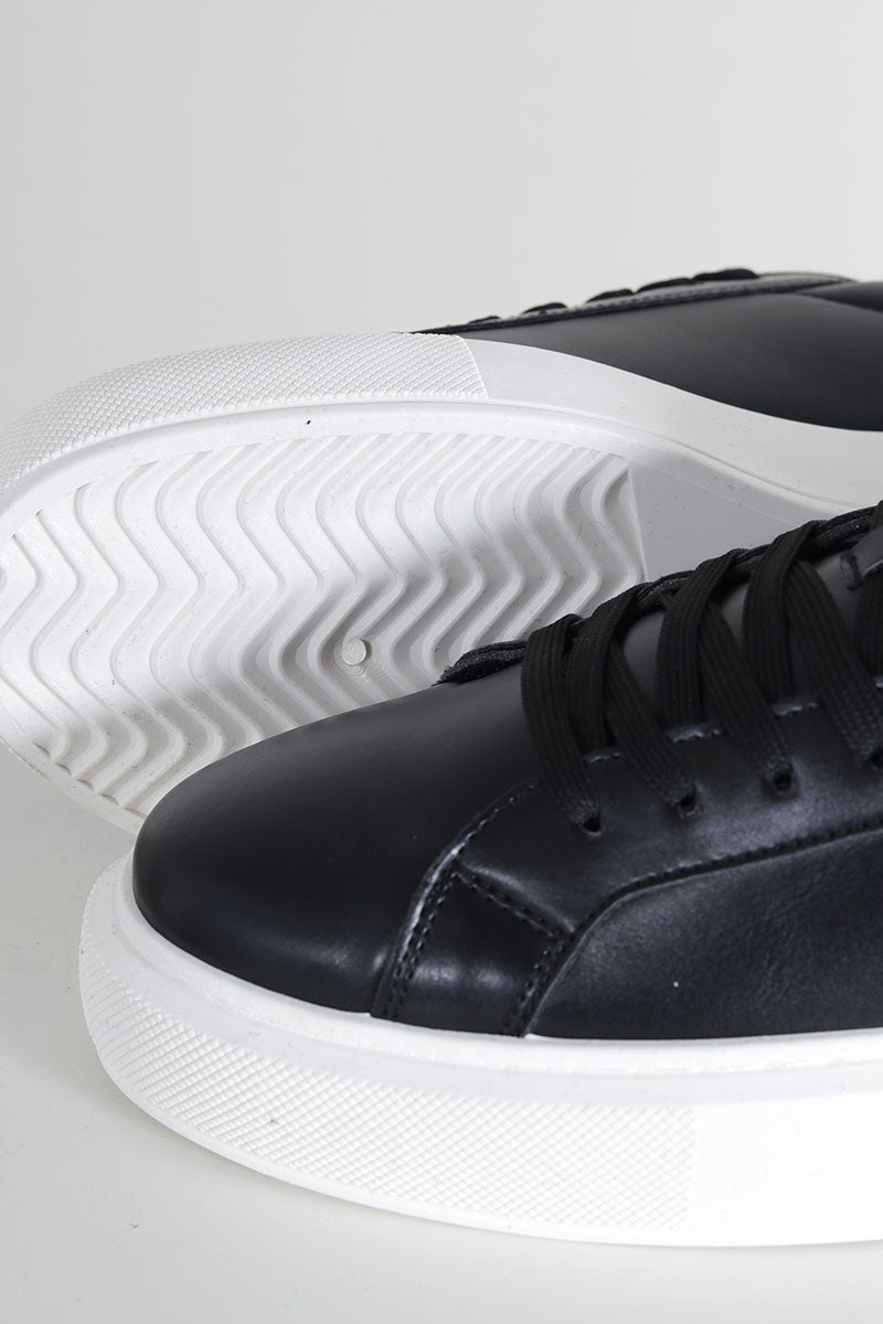 - Schwarze Lederschuhe mit weißer Gummisohle.